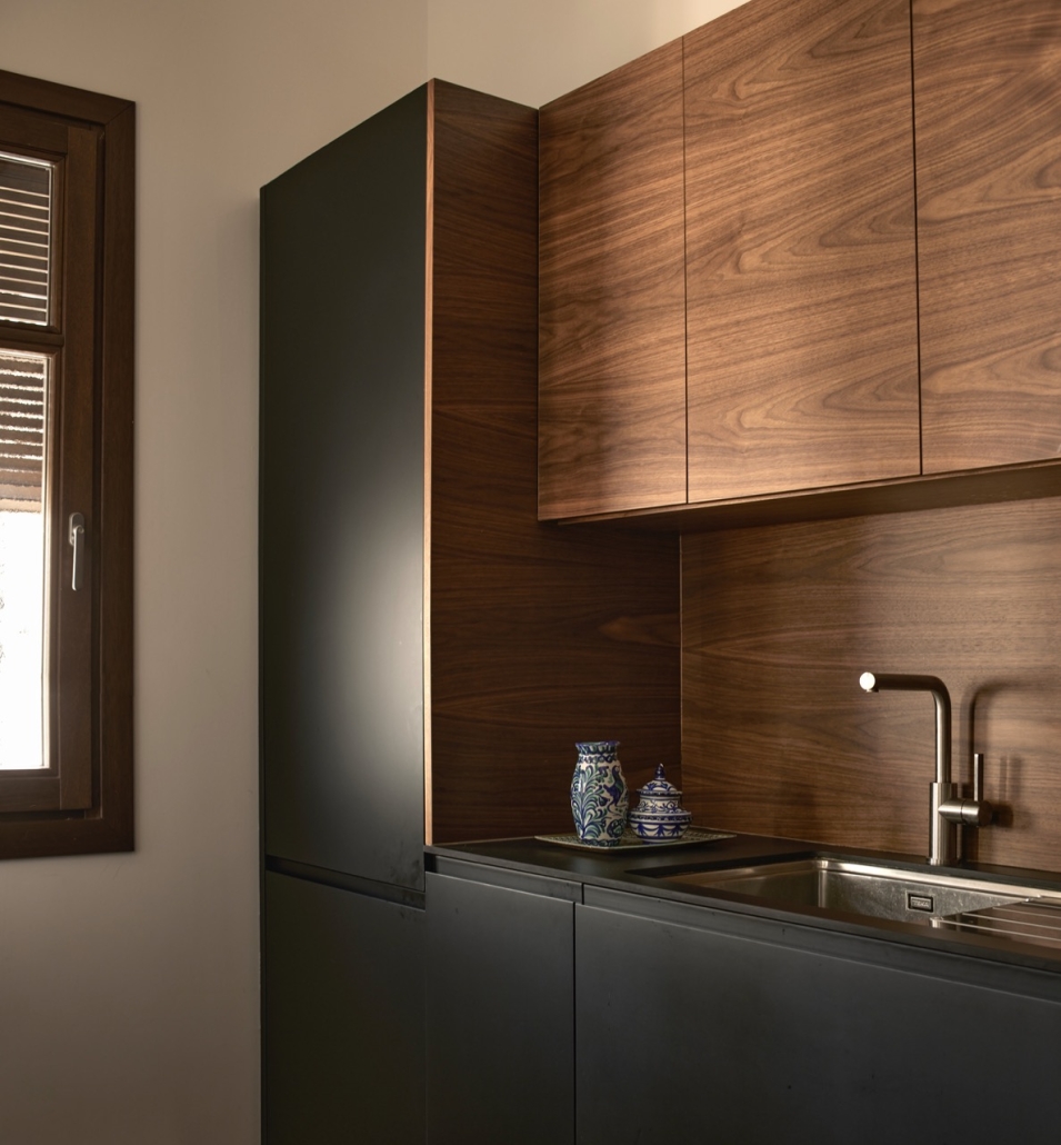 El suelo de las plantas superiores es un parquet de roble del mismo tono que el resto de la madera. La escalera que da acceso a la última planta es muy ligera, a diferencia de la escalera de bóveda tabicada.