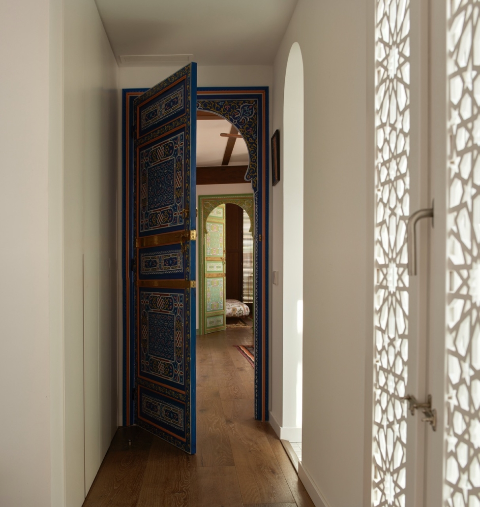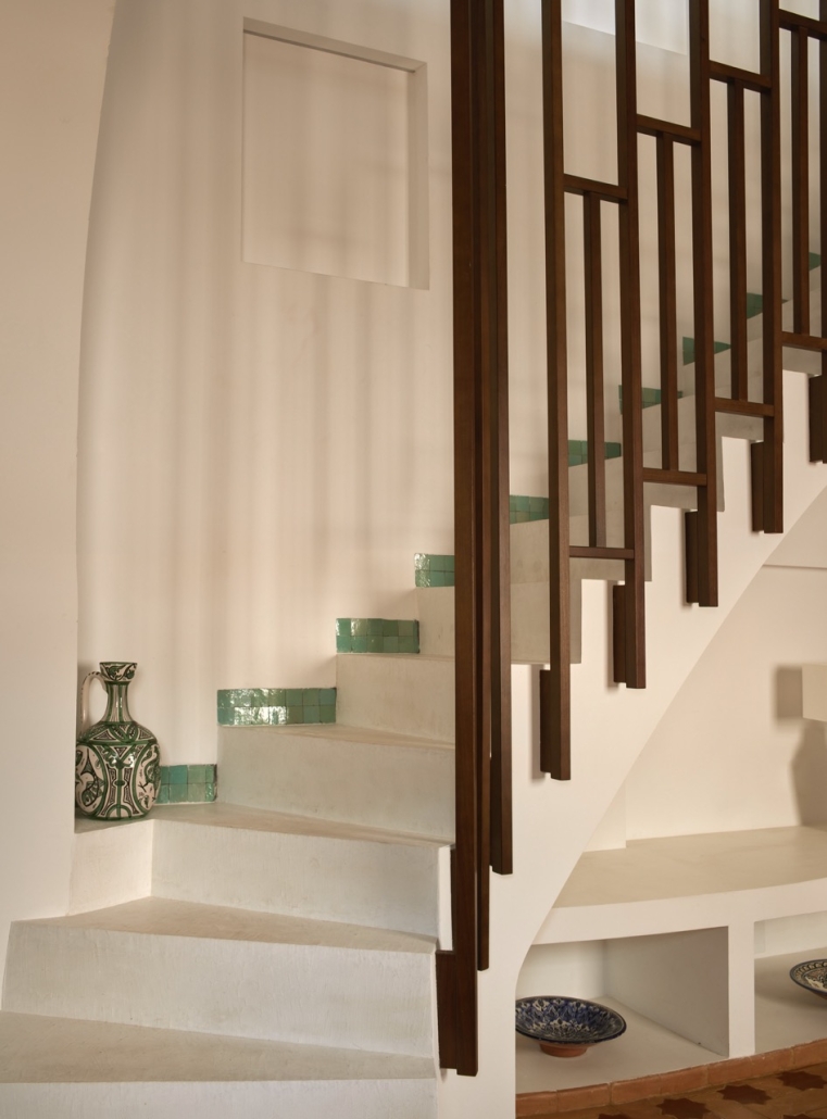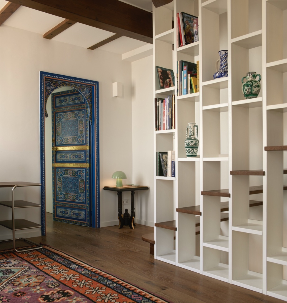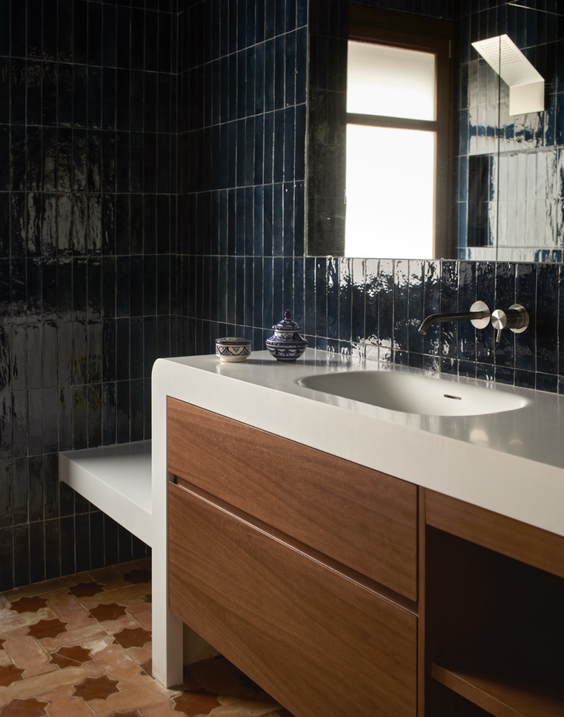 Subiendo a la primera planta, una estantería separa el distribuidor y ejerce de soporte a la escalera que lleva a la cubierta. El distribuidor es un espacio abierto que puede acoger usos distintos (teletrabajo, gimnasia, juegos…) y da acceso a la habitación verde y la habitación azul. Esta última es la suite, donde el baño está completamente revestido de zellige blanco y verde, y la hornacina de medio punto está acabada con un mosaico hecho a medida.