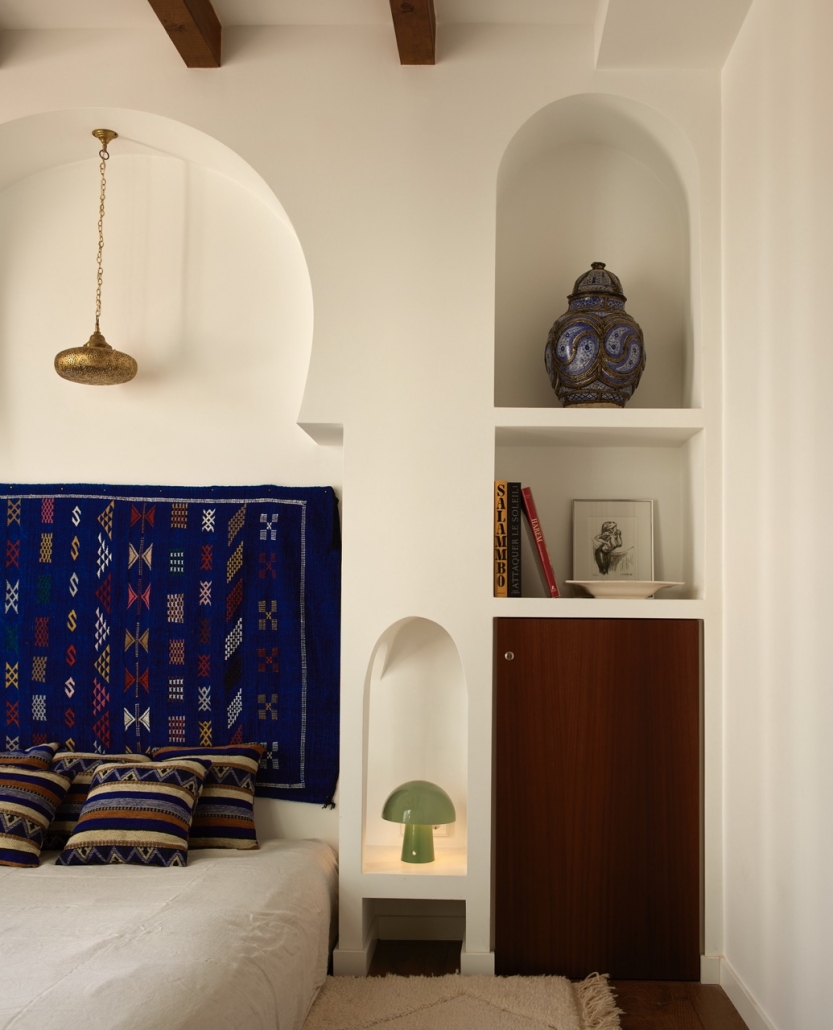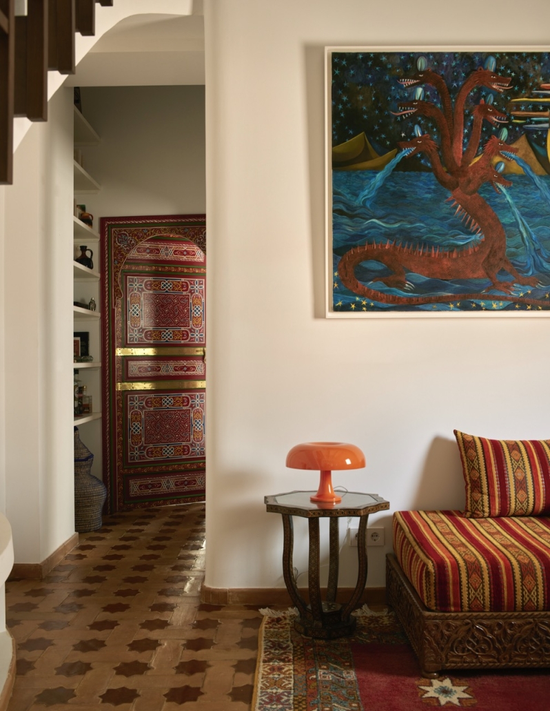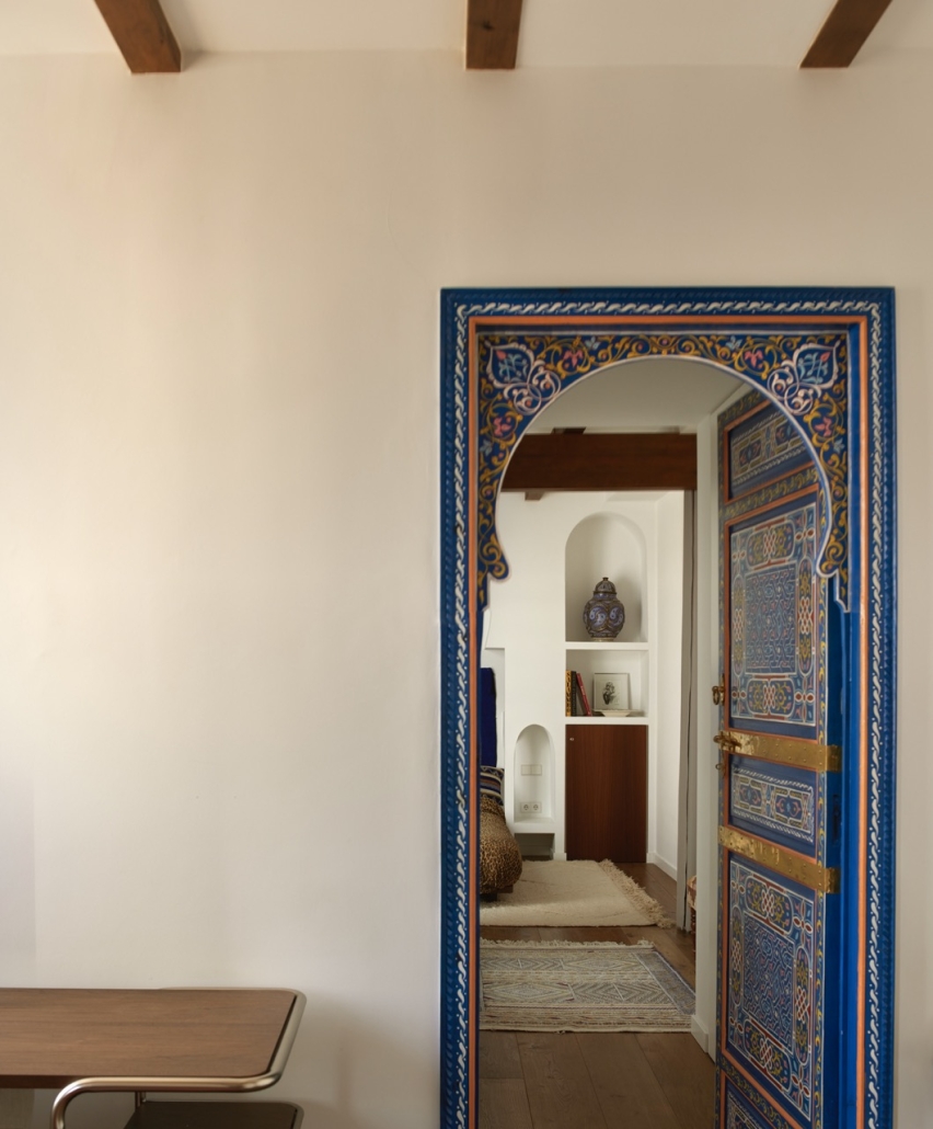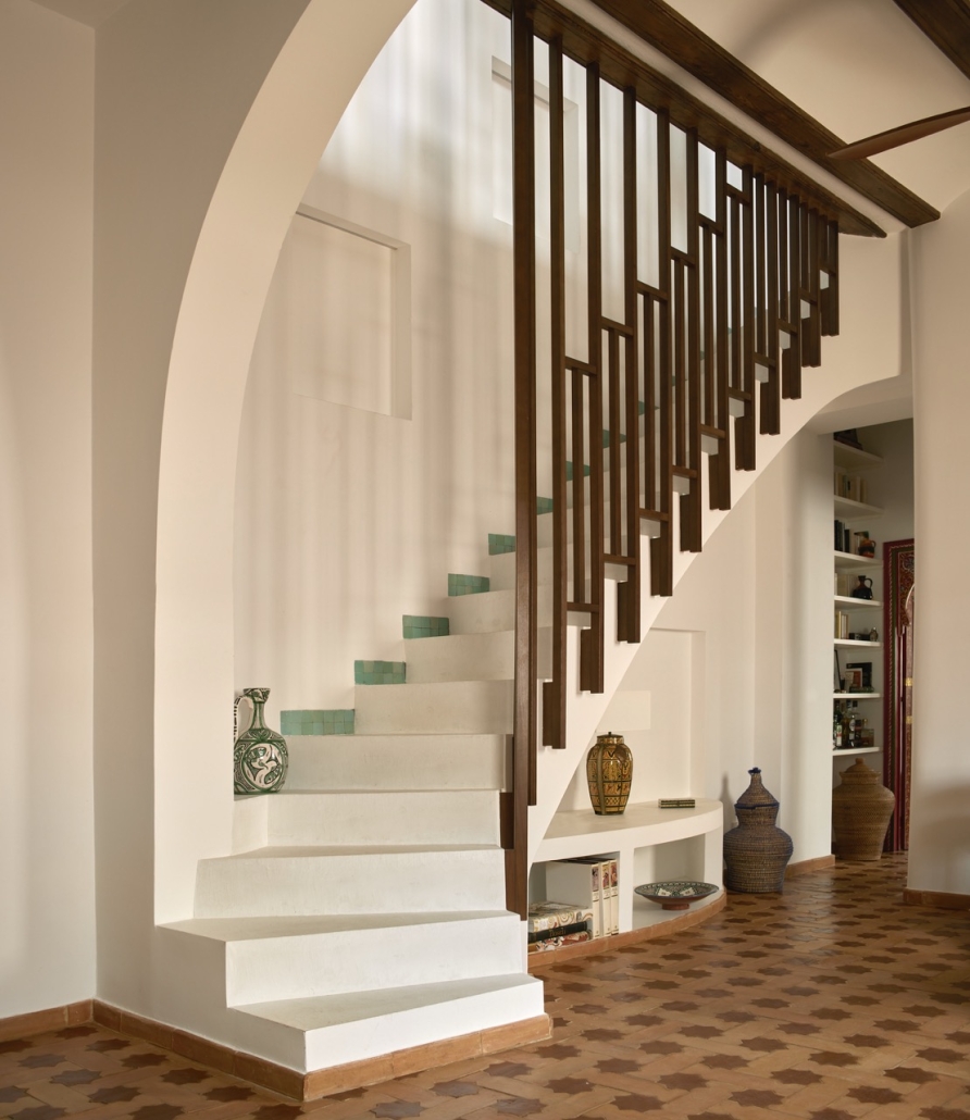 Subiendo a la primera planta, una estantería separa el distribuidor y ejerce de soporte a la escalera que lleva a la cubierta. El distribuidor es un espacio abierto que puede acoger usos distintos (teletrabajo, gimnasia, juegos…) y da acceso a la habitación verde y la habitación azul. Esta última es la suite, donde el baño está completamente revestido de zellige blanco y verde, y la hornacina de medio punto está acabada con un mosaico hecho a medida.