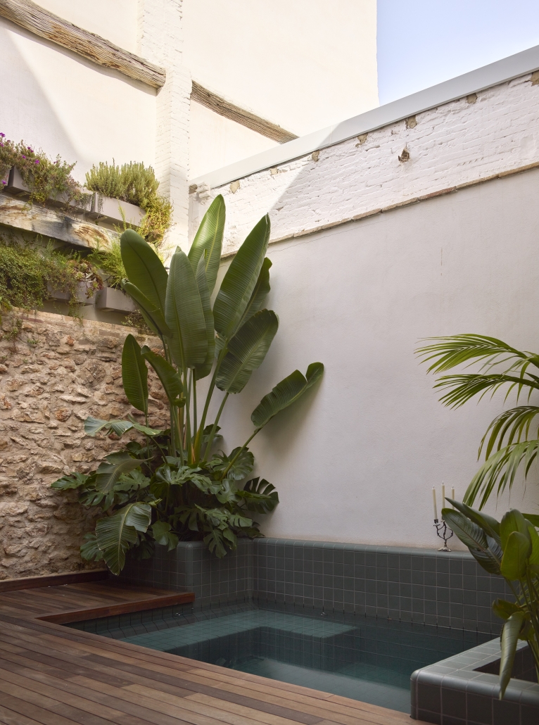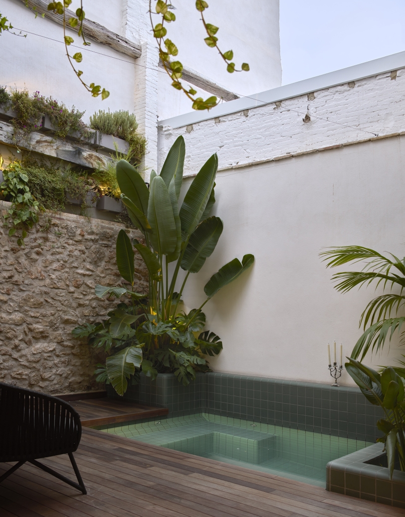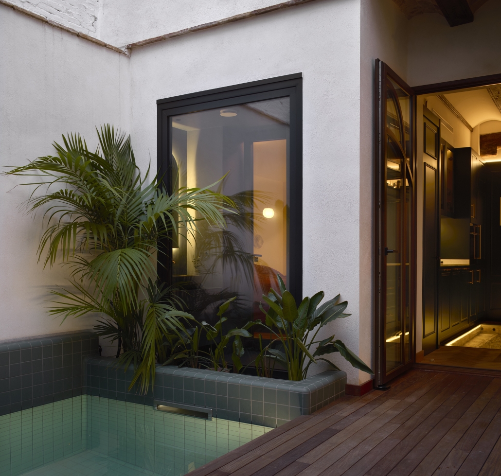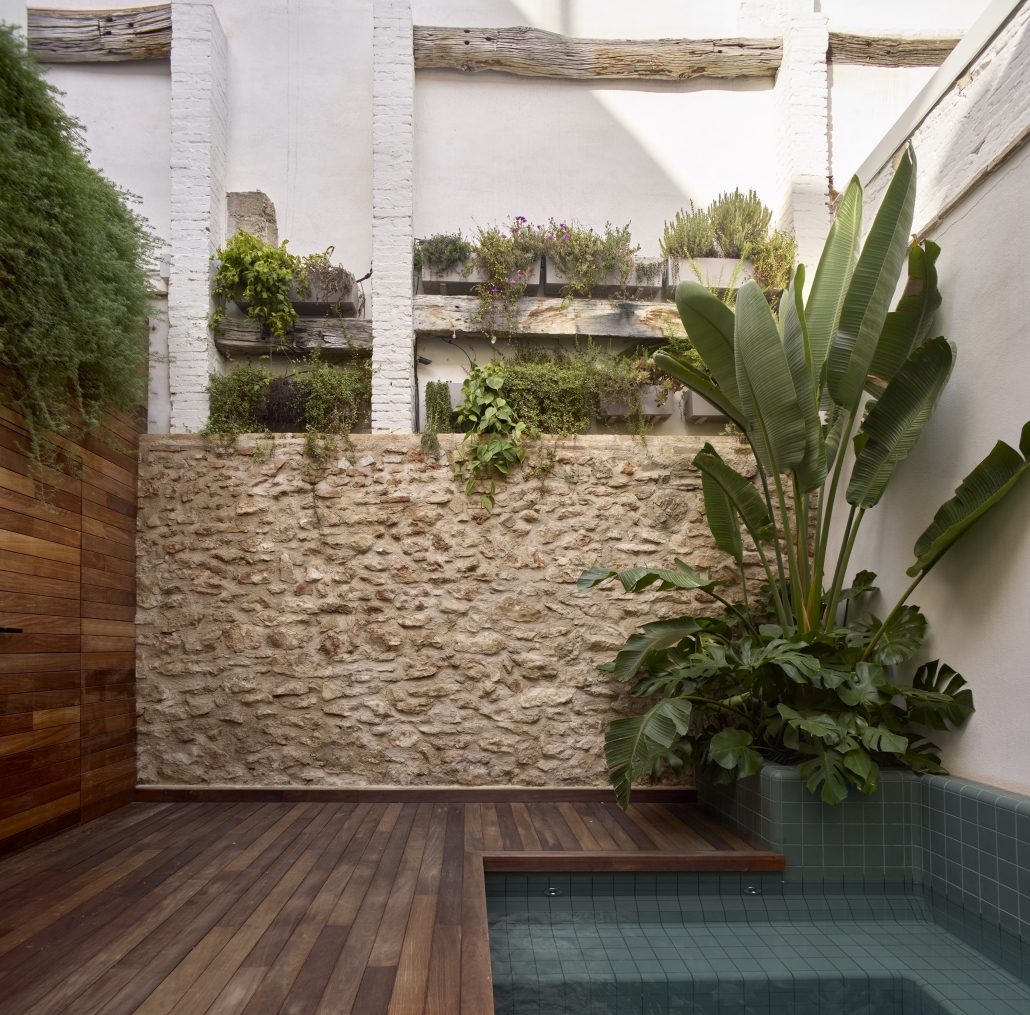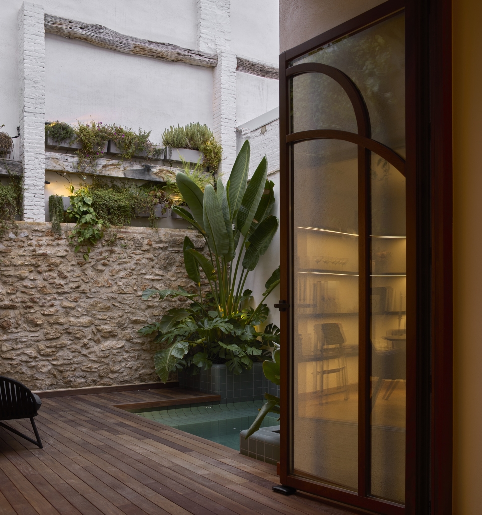 El espacio más valorado es el exterior, con su piscina, la tarima de madera, la iluminación cuidadosamente diseñada y la selección de plantas. Las zonas de día y la ducha de la suite se organizan alrededor del patio, un ambiente bucólico y relajante.
