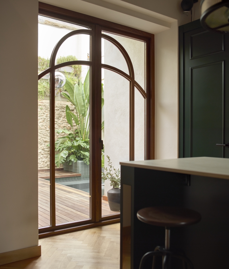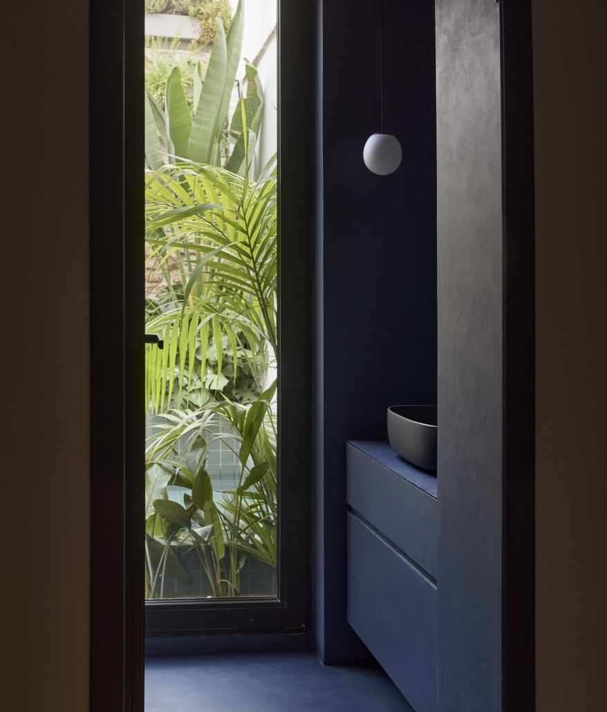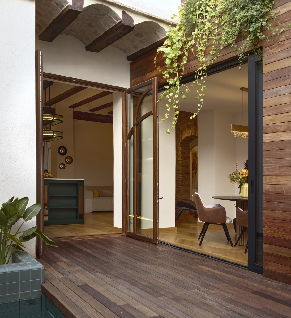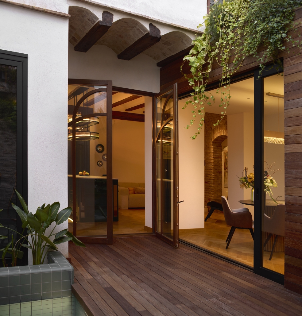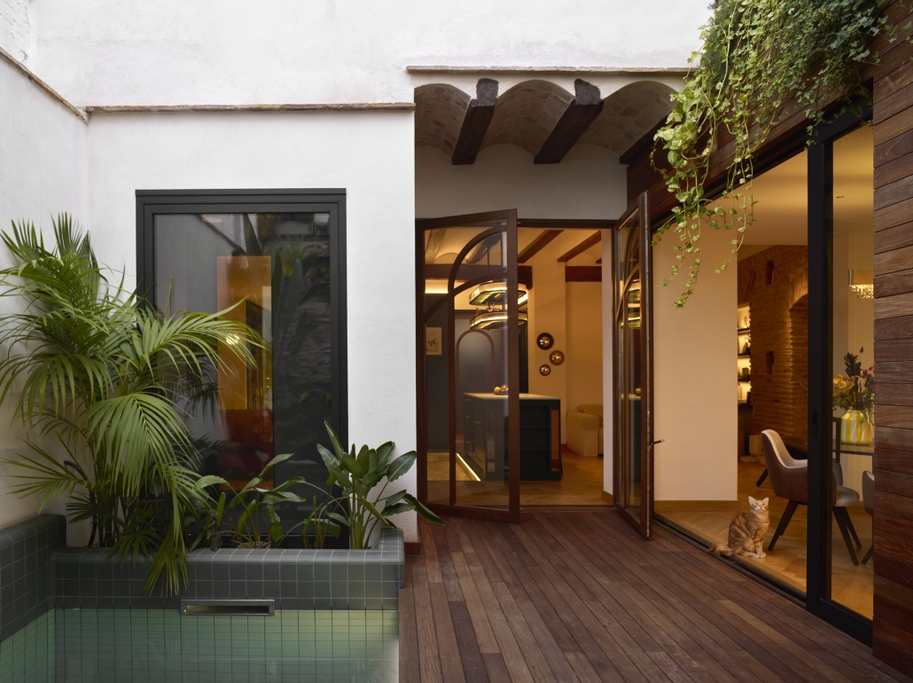 El espacio más valorado es el exterior, con su piscina, la tarima de madera, la iluminación cuidadosamente diseñada y la selección de plantas. Las zonas de día y la ducha de la suite se organizan alrededor del patio, un ambiente bucólico y relajante.