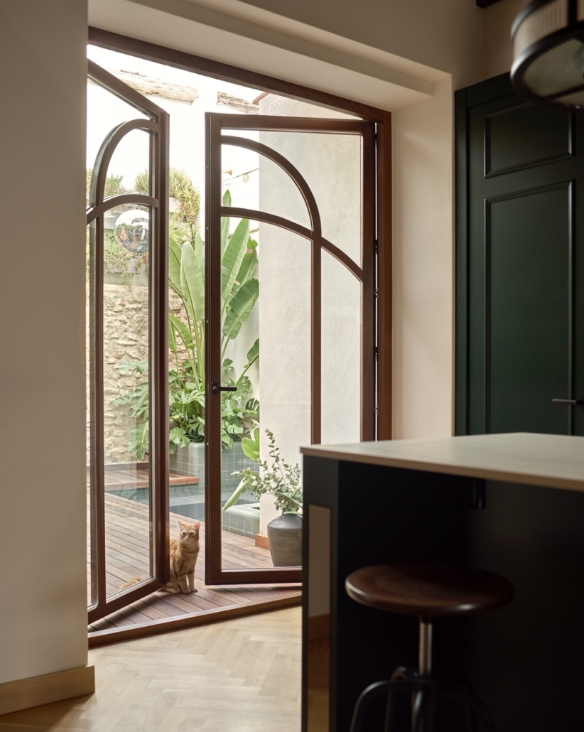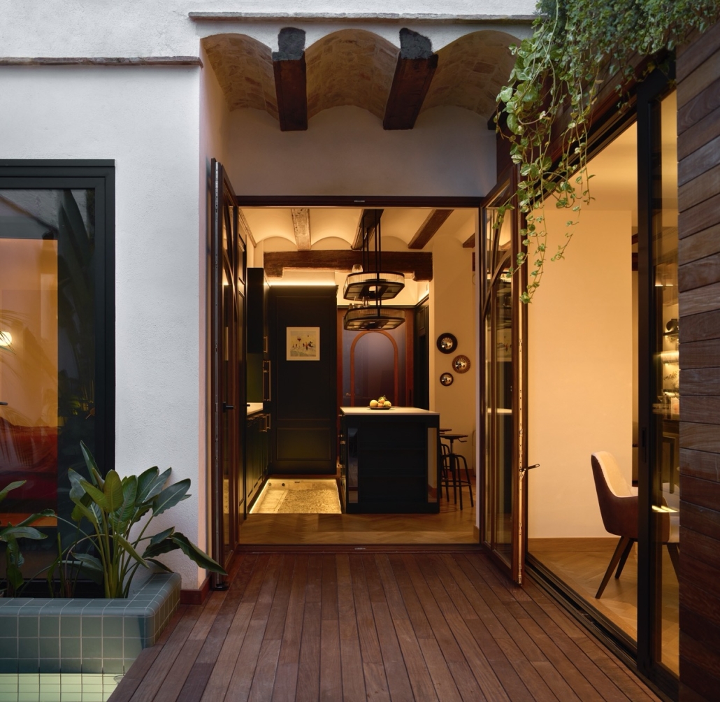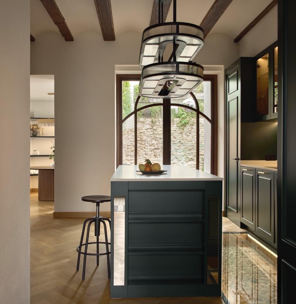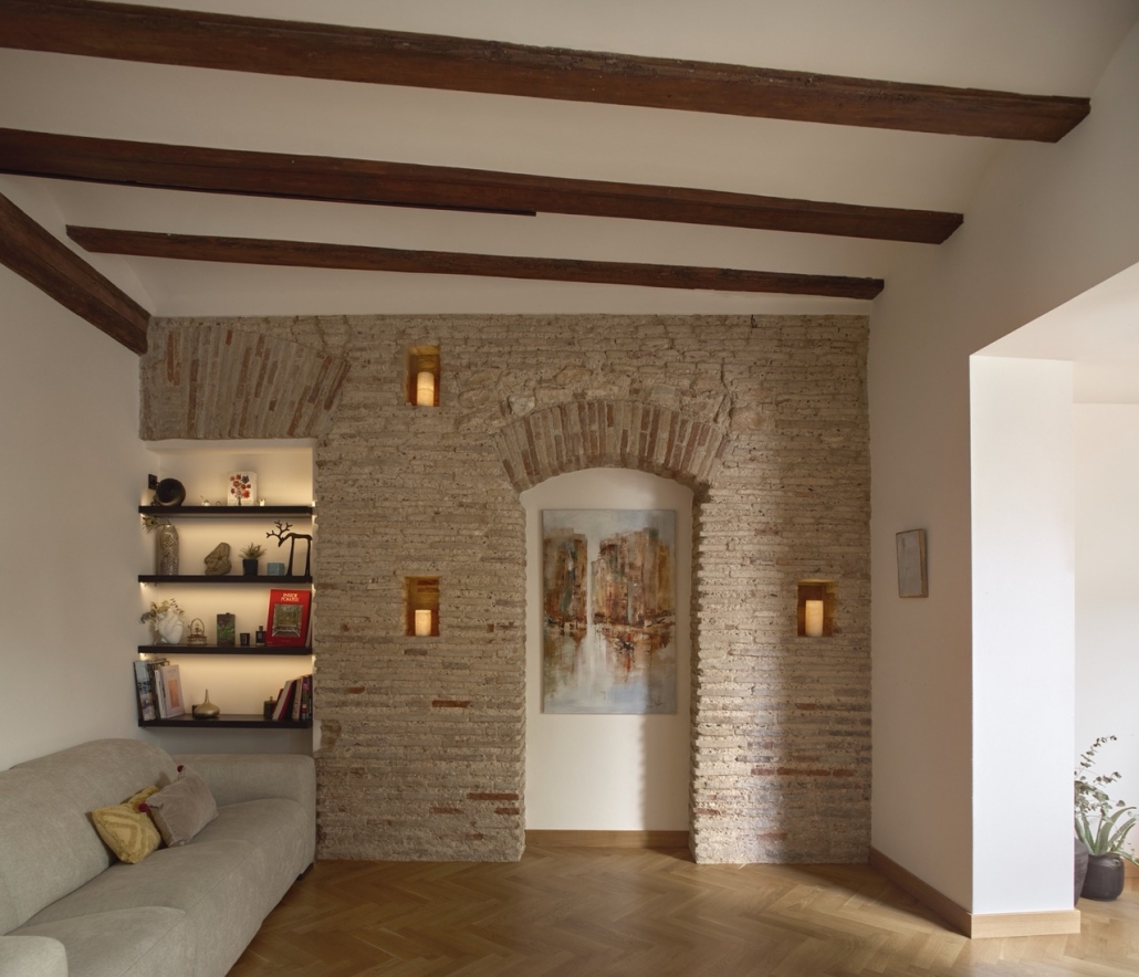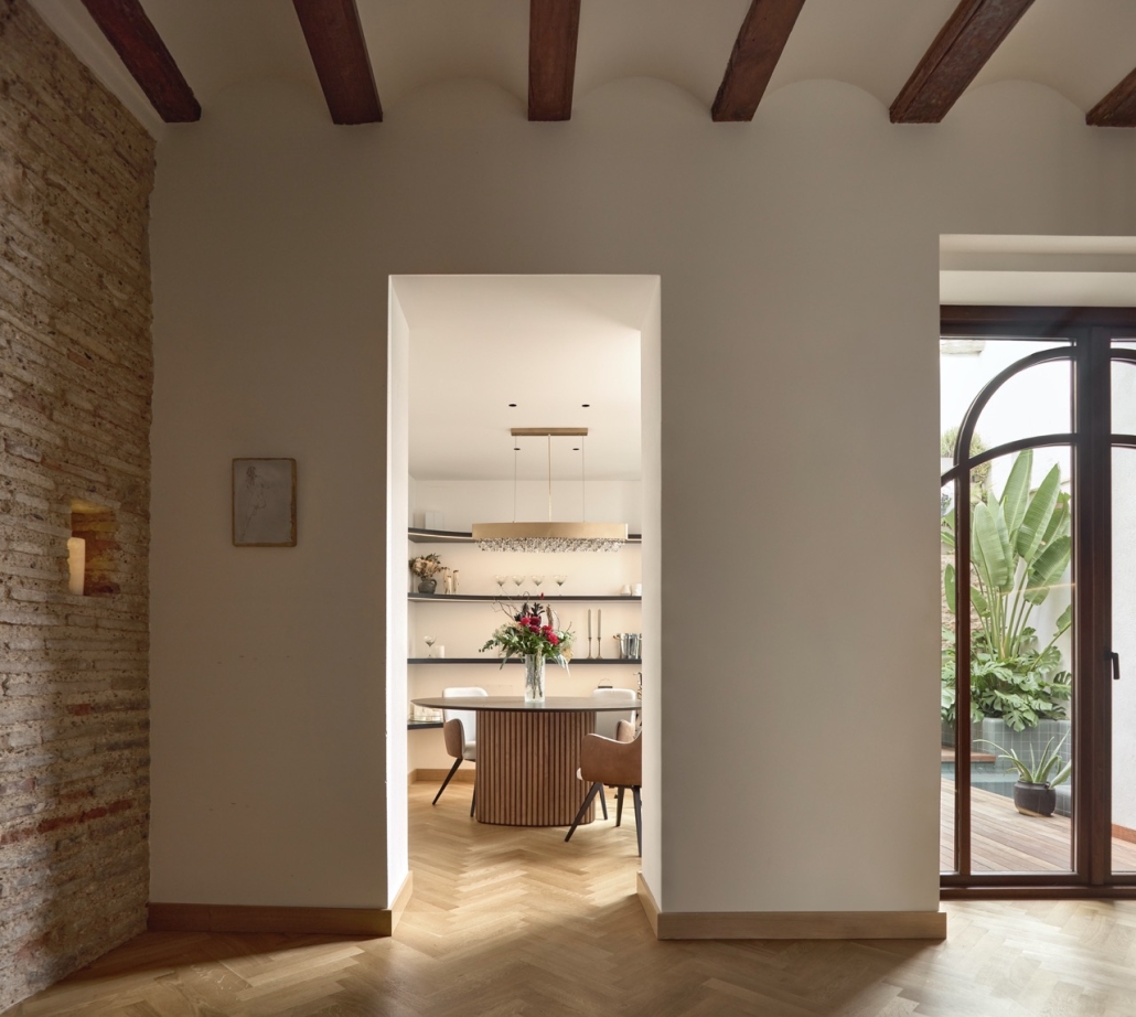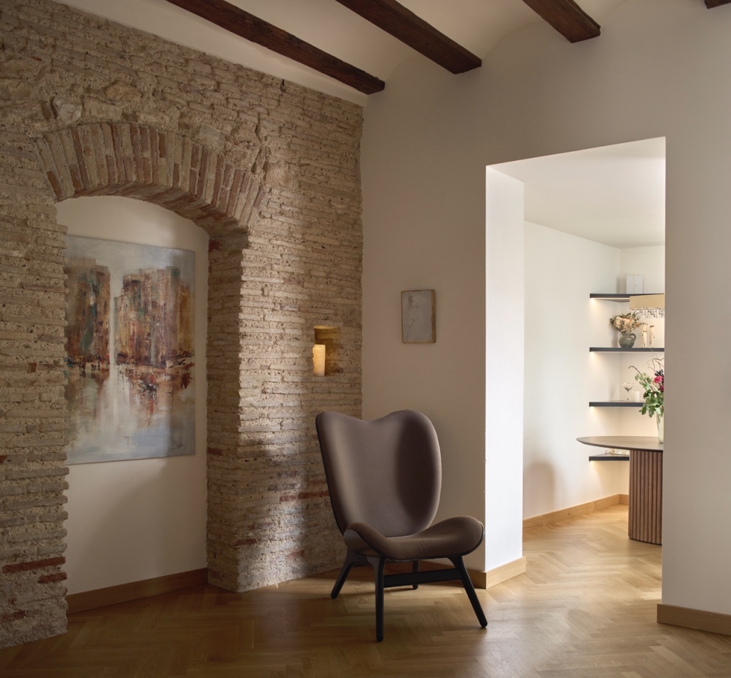 El inmueble se sitúa en una zona de gran valor arqueológico, lo que implicaba asumir una serie de costes adicionales a cargo del propietario. Sin embargo, también nos permitió conservar y poner en valor elementos históricos que hoy son protagonistas en la zona de estar: un muro con arcos del siglo XVIII y un antiguo camino de piedra que decidimos mantener visible bajo un cristal integrado en el centro de la cocina.
